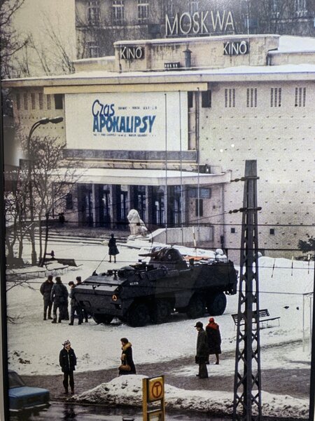 Na słynnej fotografii autorstwa Chrisa Niedenthala wojskowy transporter opancerzony stoi przed warszawskim kinem Moskwa, w którym wyświetlano film Francisa Forda Coppoli „Czas Apokalipsy". Wykonane 14 grudnia 1981 r. zdjęcie stało się jednym z symboli stanu wojennego w Polsce.