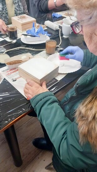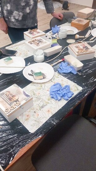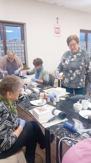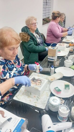 Podczas zajęć seniorki tworzyły skrzyneczki na skarby, wykorzystując motyw dzieci w zimowym klimacie. Tematyka prac oczywiście nawiązywała do zbliżających się Dni Babci i Dziadka, przywołując miłe skojarzenia, wspomnienia oraz rodzinne emocje.