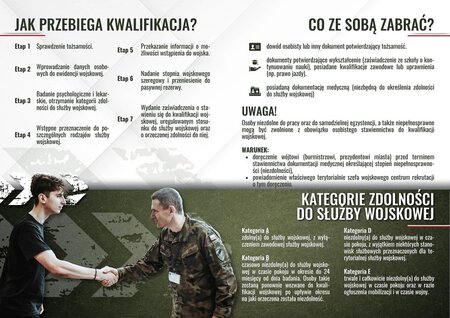 Kwalifikacja wojskowa to także doskonały moment, aby dowiedzieć się, jakie możliwości daje dzisiejsze Wojsko Polskie. Każdy, kto odwiedzi powiatową komisję, lekarską może porozmawiać z przedstawicielem Wojskowego Centrum Rekrutacji o Dobrowolnej Zasadniczej Służbie Wojskowej, Terytorialnej Służbie Wojskowej, czy o uczelniach wojskowych i szkołach podoficerskich oraz spotkać się z żołnierzami z jednostek wojskowych, którzy będą prezentować specyfikę służby wojskowej w swojej macierzystej jednostce wojskowej wraz z indywidualnym wyposażeniem żołnierskim.