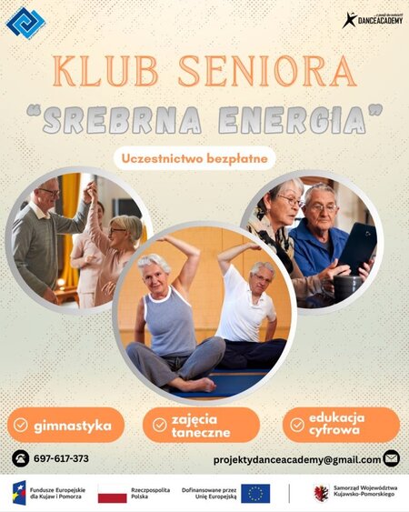 Dance Academy w Nakle nad Notecią zaprasza #do uczestnictwa w projekcie „Srebrna Energia”, skierowanego do mieszkańców powiatu nakielskiego, którzy ukończyli 60. rok życia. Inicjatywa zakłada utworzenie klubu seniora, w którym będzie miejsce na wymianę doświadczeń, aktywne spędzanie czasu wolnego oraz rozwój fizyczny seniorów.