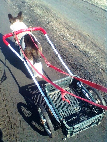 Piesek był zmuszany także do ciągnięcia wózka, jak to robią konie.