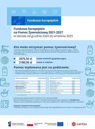 Obecna edycja – „Podprogram 2024” potrwa do 30 września 2025 roku. Celem programu jest wsparcie najbardziej potrzebujących poprzez dystrybucję paczek zawierających podstawowe artykuły spożywcze. W zestawach znajdują się m.in. mleko, makaron, konserwy, mąka, cukier, olej czy herbatniki – produkty niezbędne w codziennym życiu.