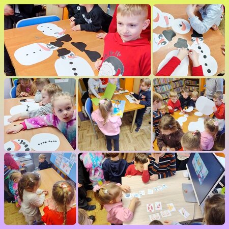 Spotkanie rozpoczęło się od czytania opowiadania o Kubusiu Puchatku i jego przyjaciołach. Dzieci z dużym zainteresowaniem słuchały historii, poznając zimowe zwyczaje bohaterów oraz ich ulubione formy spędzania czasu. Opowiadanie stało się doskonałym wprowadzeniem do dalszych aktywności. Kolejnym punktem wizyty była zabawa edukacyjna, podczas której dzieci wyszukiwały i wybierały obrazki związane z zimą doskonaląc przy tym koncentrację i spostrzegawczość. Przedszkolaki chętnie brały udział w zabawach ruchowych, które wywołały dużo radości, śmiechu i pozytywnej energii, a wspólna aktywność sprzyjała integracji grupy. Podczas zajęć plastycznych – z przygotowanych elementów tworzyły bałwanki. Powstały różnorodne i pomysłowe prace: duże i małe bałwany, każdy z noskiem i indywidualnym wyglądem. Na zakończenie spotkania dzieci miały czas na oglądanie książek z działu literatury dziecięcej. Była to doskonała okazja do bliższego poznania świata książek oraz zachęta do odwiedzania biblioteki. Wtorkowe zajęcia przebiegły w miłej i twórczej atmosferze, a przedszkolaki, z pewności, na długo zapamiętają to zimowe spotkanie z literaturą.