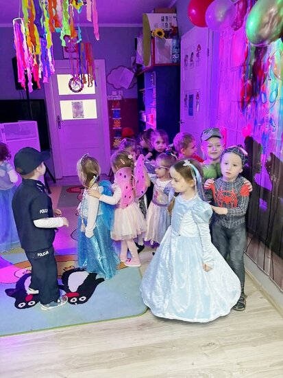 Gdy tylko rozbrzmiała muzyka, parkiet natychmiast się zapełnił. Misie tańczyły z ogromnym zaangażowaniem, Żabki skakały w rytm muzyki, Biedronki wirowały z uśmiechem na twarzy, a Motylki lekko i z gracją fruwały po sali. Nie zabrakło wspólnych kółeczek, pociągu karnawałowego oraz wesołych zabaw z balonami.