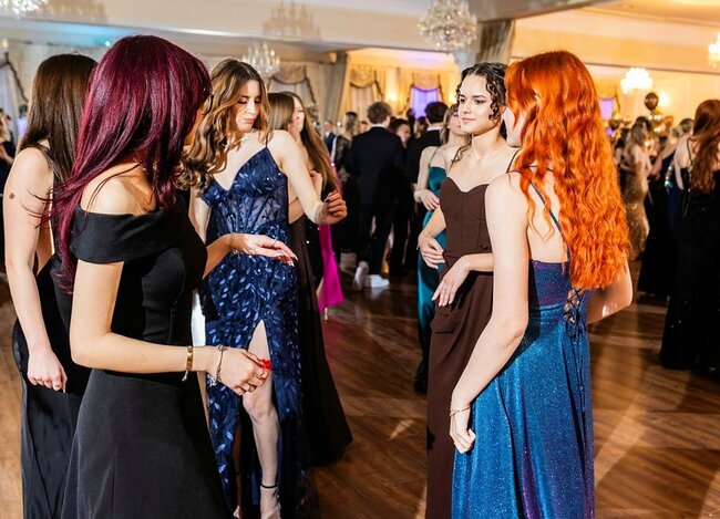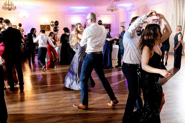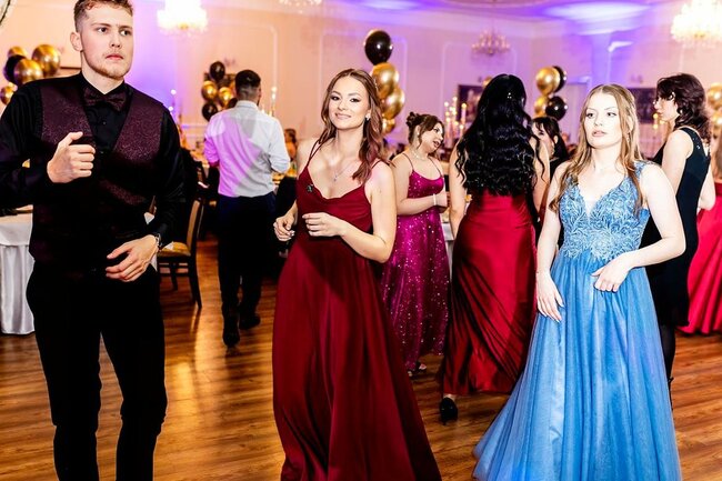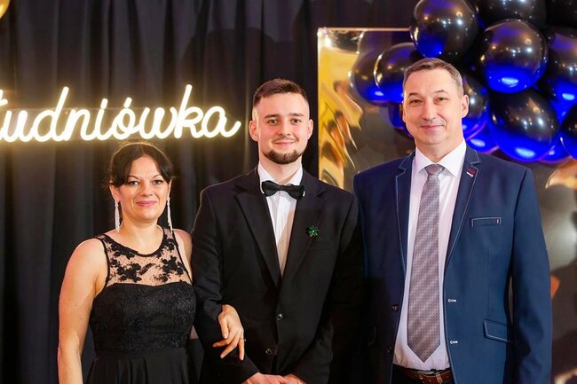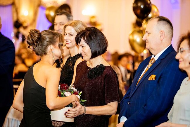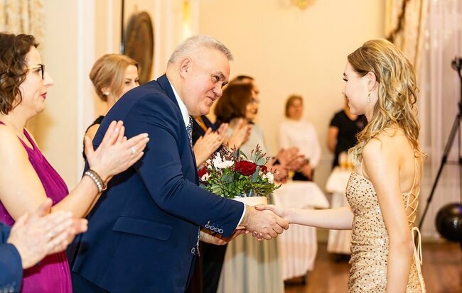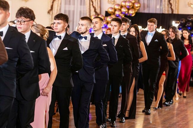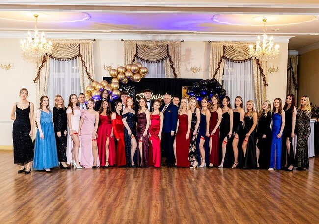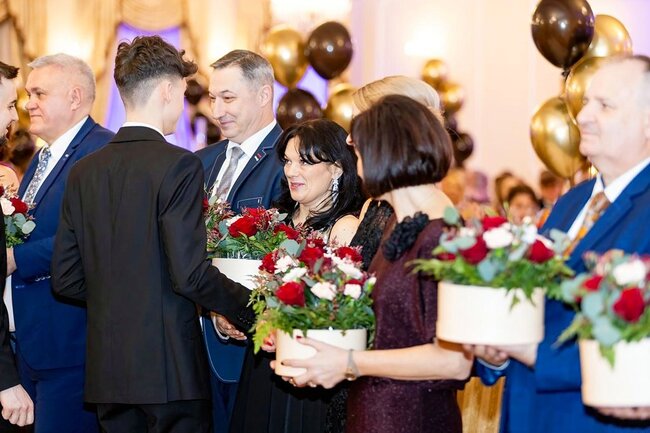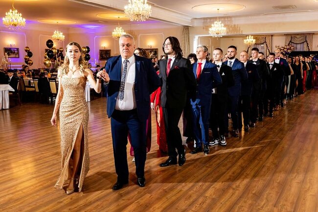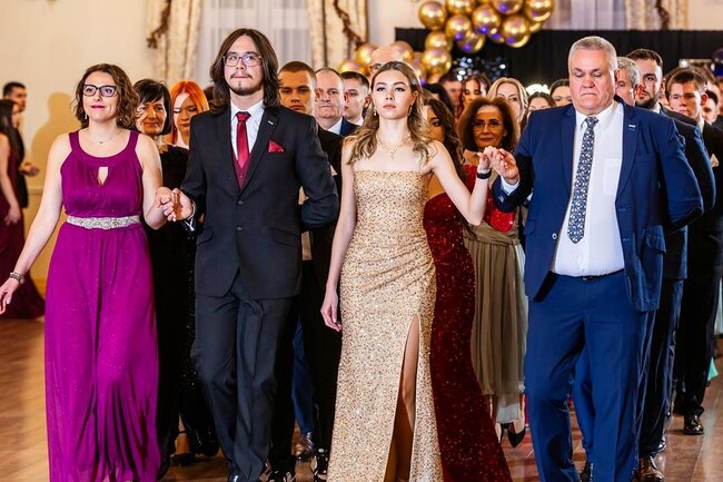 Kulminacyjnym momentem tej części wieczoru był tradycyjny polonez, poprowadzony przez dyrektora szkoły, Pana Dariusza Jana Betschera, który w ten sposób oficjalnie otworzył Bal Studniówkowy 2026. Taniec ten, pełen elegancji i dostojności, wprowadził wszystkich w podniosły nastrój uroczystości.