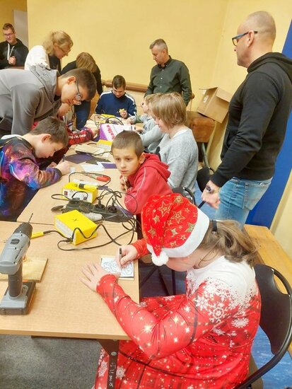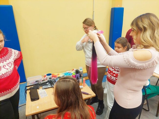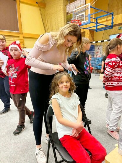 Zgromadzonych uczniów i nauczycieli powitał pan Dyrektor Mariusz Dereziński. Po części oficjalnej uczniowie uczestniczyli we wspólnych warsztatach świątecznych. Pod okiem pedagogów tworzyli ozdoby choinkowe, kartki z życzeniami dla swoich rodzin oraz kolorowe dekoracje wypalane w drewnie, które zawisną na szkolnej choince. Uczniowie spędzili cudowny czas biorąc udział w Mikołajkowych zabawach sportowych i słuchając świątecznych piosenek. Dużym zainteresowaniem cieszyło się też stanowisko fryzjerskie. Dzięki uprzejmości pani Eweliny Krysztofinskiej z salonu Ewela i Marta i zdolnej Wiktorii, uczennice mogły uczesać się w Mikołajkowe fryzury. Bardzo dziękujemy za te możliwość.