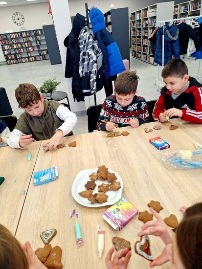 Wtorek upłynął pod znakiem dziecięcej energii i wyobraźni. Mali artyści z wielkim zaangażowaniem przygotowywali swoje ozdoby, ale największe emocje wzbudziła dodatkowa atrakcja: zdobienie pierników. Kolorowe lukry, posypki i zapach przypraw korzennych sprawiły, że w bibliotece poczuliśmy prawdziwy przedsmak Wigilii.