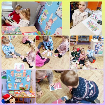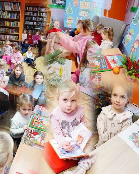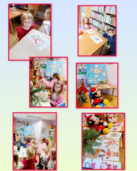 Piękny wystrój od razu przyciągał uwagę Biedronek, Motylków i Pszczółek - kolorowe lampki rozświetlające wnętrze, choinki, stroiki i pachnące gałązki świerku, a całość dopełniała piękna gwiazda betlejemska. Zapach goździków i pomarańczy unosił się w powietrzu wprowadzając dzieci w magiczny czas Bożego Narodzenia. Pani bibliotekarka opowiedziała o bożonarodzeniowych zwyczajach i obrzędach i zaprosiła do wysłuchania bajki pt „Święta Tupcia Chrupcia”. Mali goście z zainteresowaniem śledzili historię bohatera, a następnie aktywnie uczestniczyli w rozmowach na temat przeczytanego tekstu. Nie zabrakło również świątecznych zagadek, układania puzzli oraz słuchania pastorałek. Na zakończenie zajęć w bibliotece Motylki, Biedronki i Pszczółki otrzymały mikołajkową zakładkę do książki - drobny upominek, który będzie przypominał o tym przedświątecznym spotkaniu.