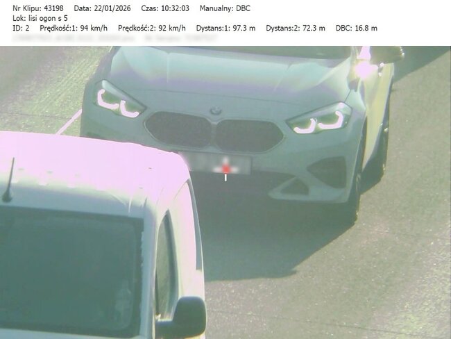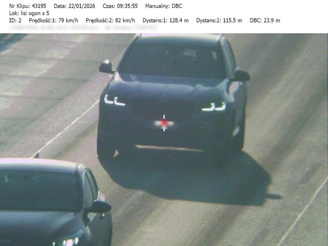Do wczorajszych (22.01.2026) działań przeprowadzonych na drodze ekspresowej S-5, bydgoscy policjanci wykorzystywali urządzenie pomiarowe TruCAM II, wyposażone w funkcję DBC (Distance Between Cars). Ta funkcja umożliwia precyzyjny pomiar odległości pomiędzy pojazdami poruszającymi się drogą ekspresową. Sprzęt ten pozwala na rejestrowanie obrazu oraz przekazywanie materiału dowodowego do patrolu znajdującego się na kolejnym odcinku trasy. Tam policjanci zatrzymują kierowców, którzy nie stosują się do przepisów, i pokazują im zarejestrowane wykroczenie na ekranie terminala.
