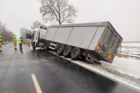 (czytaj więcej)Ciężarówka w rowie. Trudne warunki na drogach