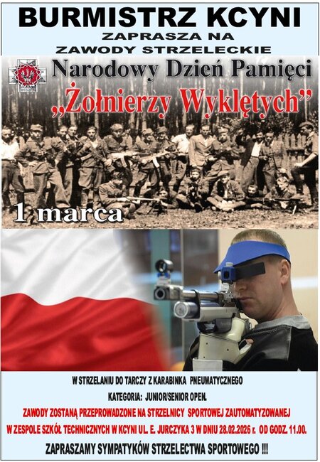 Zapraszamy na Otwarte Zawody Strzeleckie pod# patronatem Burmistrza Kcyni z okazji Narodowego Dnia Pamięci "Żołnierzy Wyklętych" ustanowionego na dzień 1 Marca.