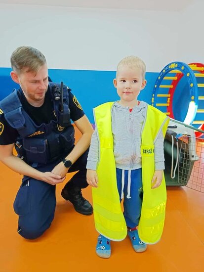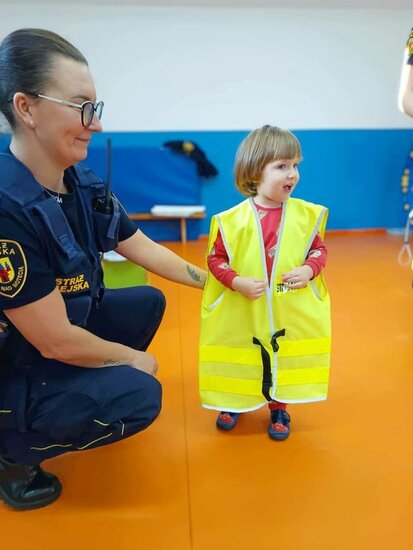 W dniu 4 listopada 2025 roku odbyło się spotkanie pierwszej grupy, w której uczestniczyli mł. strażnik Daria Kłos oraz st. inspektor Janusz Mrówczyński. Druga grupa spotkała się z aplikant Michaliną Janowicz oraz strażnikiem Tomaszem Nowakowskim w dniu 7 listopada 2025 roku. W trakcie pogadanek funkcjonariusze przypomnieli dzieciom zasady prawidłowego i bezpiecznego poruszania się jako uczestnik w ruchu drogowym, jako pieszy oraz kierujący rowerem czy hulajnogą. Strażnicy omówili również jak postępować w przypadku kontaktu z osobą obcą oraz napotkanymi zwierzętami. Dzieci utrwaliły numery alarmowe do poszczególnych służb, w tym także do Straży Miejskiej. Przedszkolaki dowiedziały się na czym polega praca strażnika miejskiego, jak wygląda przygotowanie do służby każdego dnia. Strażnicy zaprezentowali umundurowanie oraz sprzęty jakimi posługują się w trakcie wykonywania obowiązków służbowych. Uczestnicy pogadanek z dużym zainteresowaniem słuchali rad i wskazówek strażników, bardzo aktywnie brali udział w dyskusjach.