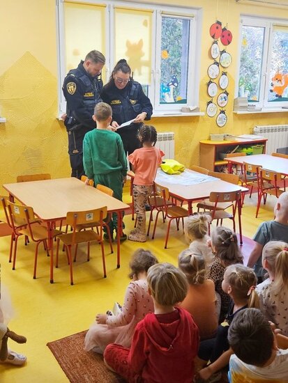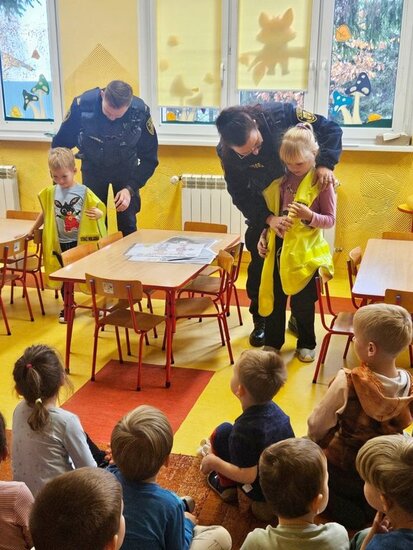 4 listopada aplikant #Michalina Janowicz i strażnik Tomasz Nowakowski przeprowadzili pogadanki z 4 grupami przedszkolaków w Ślesinie.