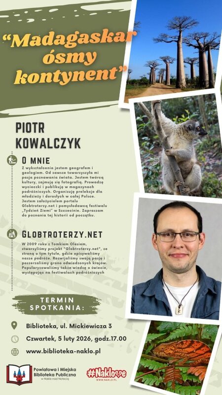 Powiatowa i Miejska Biblioteka Publiczna w Nakle nad Notecią zaprasza na spotkanie z podróżnikiem Piotrem Kowalczykiem – Madagaskar ósmy kontynent.