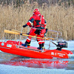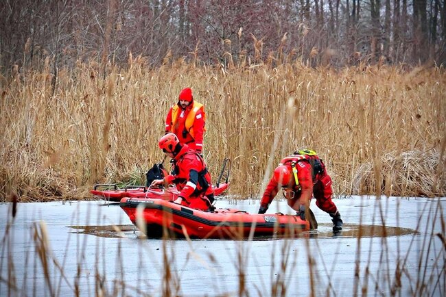 Praca na lodzie: Strażacy co kilka metrów wycinają otwory w pokrywie lodowej przy użyciu pił spalinowych. Dzięki temu nasi ratownicy mogą wprowadzać sonary i dokładnie przeszukiwać dno rzeki.