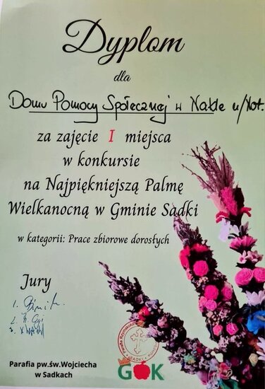 Miło nam również poinformować, że podczas konkursu na palmy wielkanocne w Parafii pw. Św. Wojciecha w Sadkach Dom Pomocy Społecznej zdobył I miejsce w kategorii: Prace zbiorowe dorosłych. To wyróżnienie jest efektem zaangażowania, kreatywności i wspólnej pracy mieszkańców oraz pracowników naszego Domu.