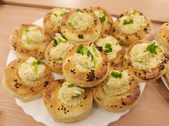 - gniazdka z ciasta francuskiego z pastą jajeczną