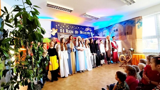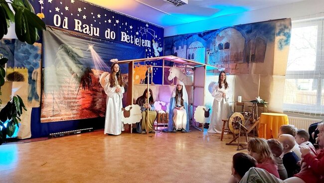 Na zakończenie obejrzeliśmy piękne przedstawienie jasełkowe w wykonaniu uczniów klas 7 i 8, przygotowane pod czujnym okiem Pani Grażyny Kamińskiej. Dziękujemy młodym aktorom oraz Pani Grażynie za wspaniały występ i świąteczne przesłanie.