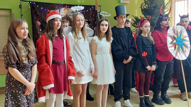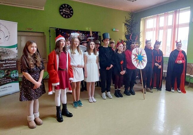 Wtorkowy występ uczniów z klasy 6b podzielony na 2 części. Grupa dziewczyn zaprezentowała taniec, następnie w dalszej części było wspólne kolędowanie Mieszkańców z młodzieżą z Zespołu Szkolno-Przedszkolnego nr 3 w Nakle nad Notecią.