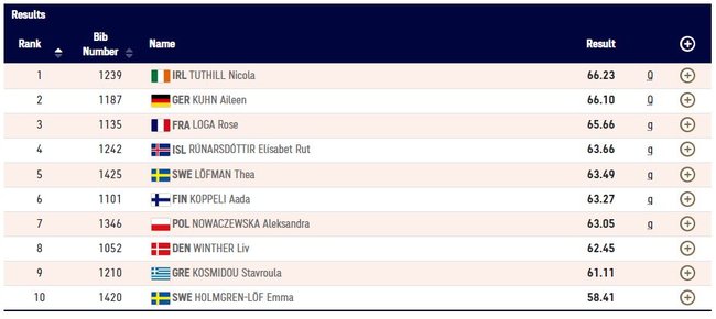 Zakwalifikowała się do finału uzyskując wynik 63,05 (7.miejsce). W finale wystąpi 14 lipca o godz. 20.45.