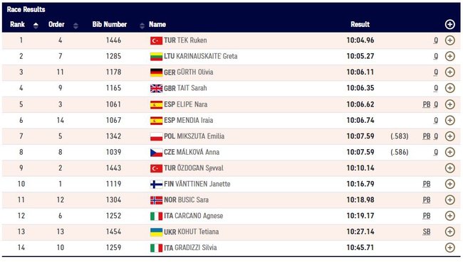Zakwalifikowała się do finału pobijając swój rekord życiowy wynikiem 10:07.59 (.583) i zajmując 7.miejsce. W finale wystąpi 15 lipca o godz. 17.05 razem z dwiema innymi reprezentantkami Polski: Agnieszką Chorzępą i Julią Koralewską.