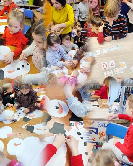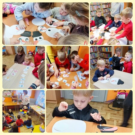 Spotkanie rozpoczęło się od czytania opowiadania o Kubusiu Puchatku i jego przyjaciołach. Dzieci z dużym zainteresowaniem słuchały historii, poznając zimowe zwyczaje bohaterów oraz ich ulubione formy spędzania czasu. Opowiadanie stało się doskonałym wprowadzeniem do dalszych aktywności. Kolejnym punktem wizyty była zabawa edukacyjna, podczas której dzieci wyszukiwały i wybierały obrazki związane z zimą doskonaląc przy tym koncentrację i spostrzegawczość. Przedszkolaki chętnie brały udział w zabawach ruchowych, które wywołały dużo radości, śmiechu i pozytywnej energii, a wspólna aktywność sprzyjała integracji grupy. Podczas zajęć plastycznych – z przygotowanych elementów tworzyły bałwanki. Powstały różnorodne i pomysłowe prace: duże i małe bałwany, każdy z noskiem i indywidualnym wyglądem. Na zakończenie spotkania dzieci miały czas na oglądanie książek z działu literatury dziecięcej. Była to doskonała okazja do bliższego poznania świata książek oraz zachęta do odwiedzania biblioteki. Wtorkowe zajęcia przebiegły w miłej i twórczej atmosferze, a przedszkolaki, z pewności, na długo zapamiętają to zimowe spotkanie z literaturą.