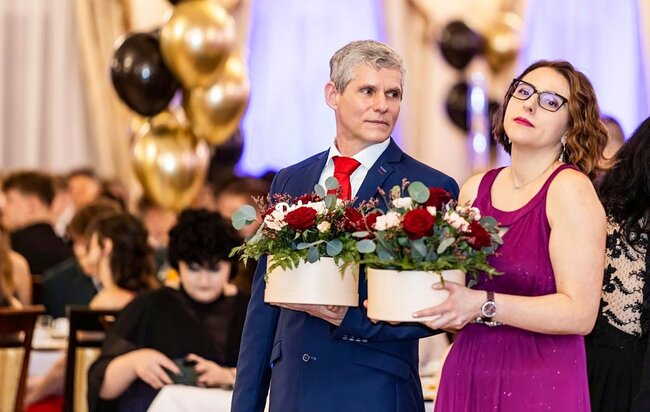 Szczególnie wzruszającym momentem wieczoru były podziękowania i wręczenie kwiatów. Maturzyści wyrazili wdzięczność dyrekcji szkoły: Panu Dyrektorowi Dariuszowi Janowi Betscherowi, Pani Wicedyrektor Sandrze Kurdynowskiej oraz Panu Wicedyrektorowi Tomaszowi Sutemu, a także Pani Grażynie Kinderman, kierownikowi szkolenia praktycznego – za życzliwość, troskę o rozwój uczniów oraz stworzenie przyjaznego miejsca do nauki.
