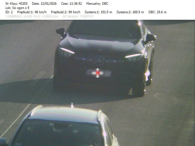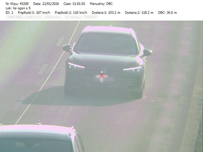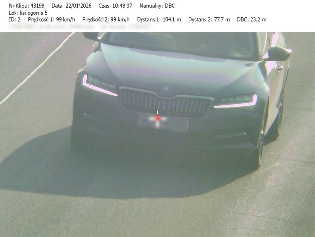 Do wczorajszych (22.01.2026) działań przeprowadzonych na drodze ekspresowej S-5, bydgoscy policjanci wykorzystywali urządzenie pomiarowe TruCAM II, wyposażone w funkcję DBC (Distance Between Cars). Ta funkcja umożliwia precyzyjny pomiar odległości pomiędzy pojazdami poruszającymi się drogą ekspresową. Sprzęt ten pozwala na rejestrowanie obrazu oraz przekazywanie materiału dowodowego do patrolu znajdującego się na kolejnym odcinku trasy. Tam policjanci zatrzymują kierowców, którzy nie stosują się do przepisów, i pokazują im zarejestrowane wykroczenie na ekranie terminala.