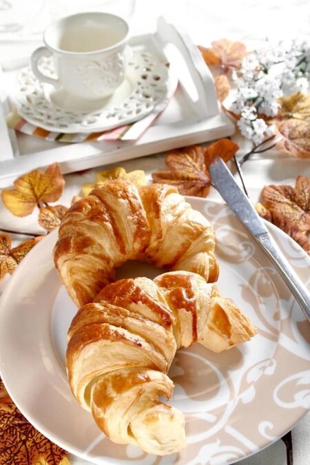 Ciasto francuskie rozmrozić i podzielić na równej wielkości trójkąty o długich bokach i krótszej podstawie. Na każdym trójkącie położyć po łyżeczce startego sera żółtego. Brzegi posmarować białkiem. Każdy trójkąt zrolować od podstawy w kierunku wierzchołka i nadać mu kształt rogalika. Ważne, aby rogaliki zwijać z początku nieco luźniej, a potem bardziej ściśle. Następnie ułożyć na blasze wyłożonej papierem do pieczenia. Piec w piekarniku z termoobiegiem. Do croissantów można dodać również konfitury lub czekoladę.