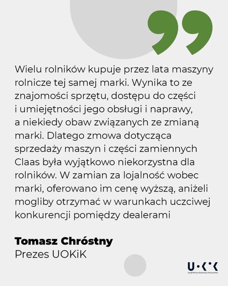 – Wielu rolników kupuje przez lata maszyny rolnicze tej samej marki. Wynika to ze znajomości sprzętu, dostępu do części i umiejętności jego obsługi i naprawy, a niekiedy obaw związanych ze zmianą marki. Dlatego zmowa dotycząca sprzedaży maszyn i części zamiennych Claas była wyjątkowo niekorzystna dla rolników. W zamian za lojalność wobec marki, oferowano im cenę wyższą, aniżeli mogliby otrzymać w warunkach uczciwej konkurencji pomiędzy dealerami – mówi Prezes UOKiK Tomasz Chróstny.