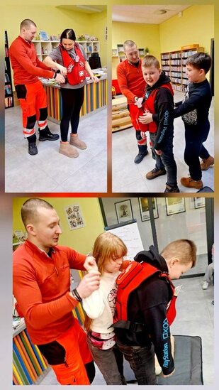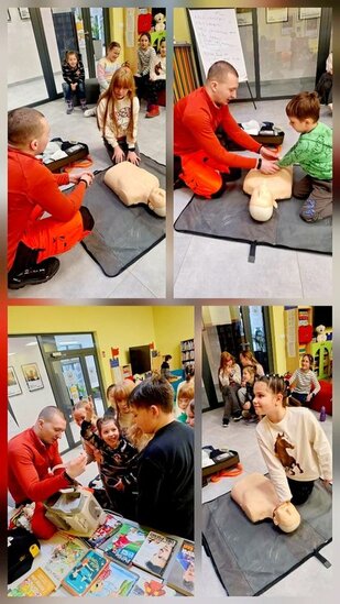 Jednym z najbardziej interesujących wydarzeń było spotkanie z ratownikiem, Panem Łukaszem Nowakiem, który opowiedział o swojej pracy oraz o zasadach udzielania pierwszej pomocy. Uczestnicy dowiedzieli się, jak reagować w sytuacjach zagrożenia i jak ważna jest szybka pomoc drugiemu człowiekowi. Dzieci z dużym zainteresowaniem zadawały pytania i chętnie brały udział w pokazie.