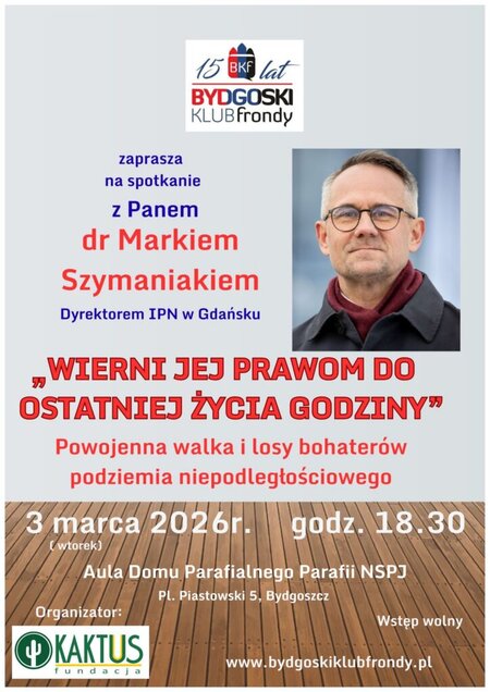 Bydgoski Klub Frondy zaprasza na# spotkanie z Panem dr Markiem Szymaniakiem, Dyrektorem IPN w Gdańsku, który podejmie temat: „Wierni Jej prawom do ostatniej życia godziny. Powojenna walka i losy bohaterów podziemia niepodległościowego”.