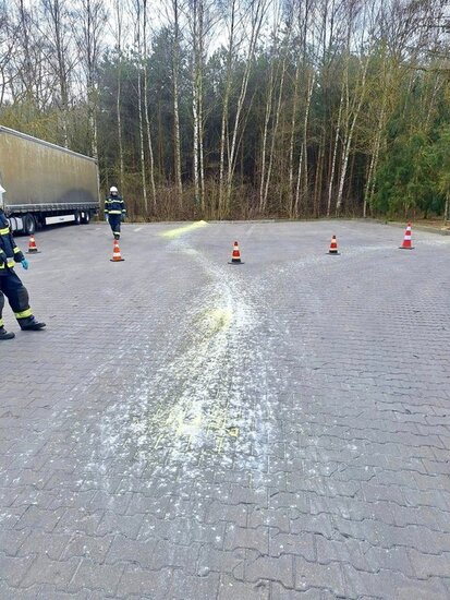 Ponadto podjęto interwencję w związku z rozsypaniem nieznanej substancji chemicznej na parkingu przy jednej ze stacji benzynowych. Na miejscu działania prowadzono wspólnie ze specjalistyczną grupą ratownictwa chemiczno-ekologicznego z Bydgoszczy.