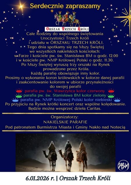 Tego dnia spotkamy się na Mszy Świętej we wszystkich nakielskich kościołach: w kościele pw. św. Wawrzyńca i kościele pw. św. Stanisława BM o godz. 12.00, a w kościele pw. NMP Królowej Polski o godz. 11.30. Po Mszy Świętej wyruszą trzy orszaki na Rynek, prowadzone przez Króla. Każdą parafię obowiązuje inny kolor. Prosimy o wykonanie koron królewskich w kolorze danej parafii i zaakcentowanie kolorem w ubiorze przynależności do swojej parafii. Parafia pw. św. Wawrzyńca kolor czerwony, parafia pw. św. Stanisława BM kolor zielony, a parafia pw. NMP Królowej Polski kolor niebieski. Po przyjściu na Rynek krótki koncert oraz wspólne kolędowanie. Będzie można wesprzeć dzieła Caritas.