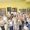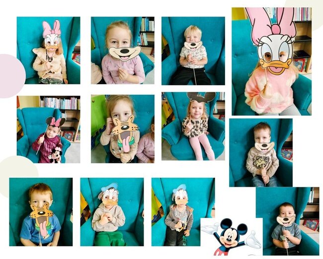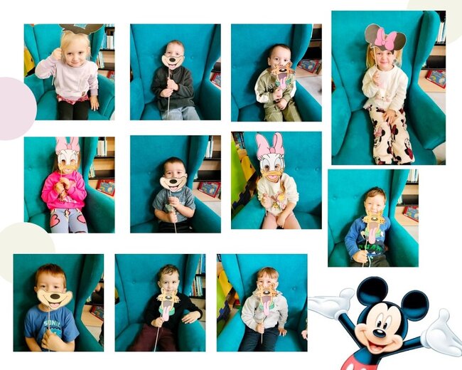Żabki, Biedronki, Zajączki, Stokrotki i Pszczółki z Przedszkola "Bajkowa Łąka" również świętowały ten szczególny dzień w bibliotece dziecięcej. Choć przez chwilę mogły wcielić się w postać Myszki Miki oraz jej przyjaciół. Okazało się, że wszystkie dzieci znają postać Mikiego i bardzo ją lubią. Dzieci wysłuchały bajki o przesympatycznej Myszce, w której poznały również przyjaciół Myszki Miki, karmiły Myszkę ciasteczkami, układały puzzle, naśladowały Kaczora Donalda, Psa Pluto, Myszkę Minnie. Przedszkolaki mogły również zrobić sobie zdjęcie w bajkowych maskach.